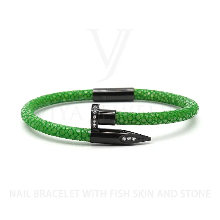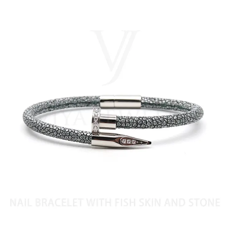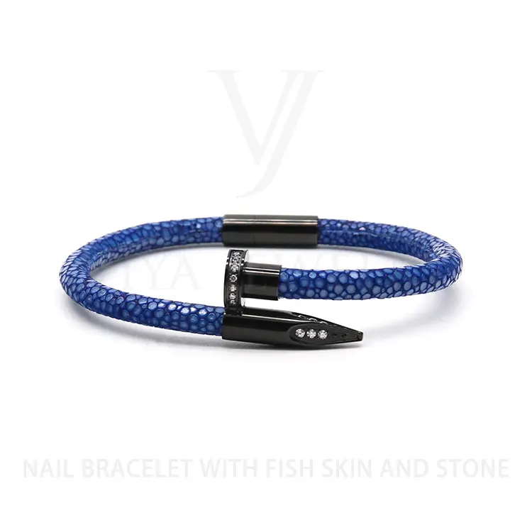 Item No:VJST-C2Z Genuine Exotic Stingray Leather Luxury Bracelet Leather Material:Grade A Stingray 5mm Leather Cord Metal material:Surgical 316L Stainless Steel Available Nail Metal Color:Silver/Rose Gold/18K Gold/Black With new technology plated,2years color guarantee Popular size Female: 17cm 18cm 18.5cm Male:19cm 20cm 21cm Customzied size are available Customized logo are welcome MOQ:20pcs Leadtime:Within 5work days DHL Door to door service Worldwilde shipping