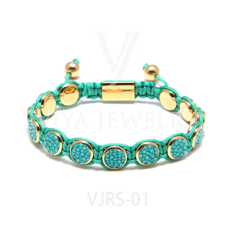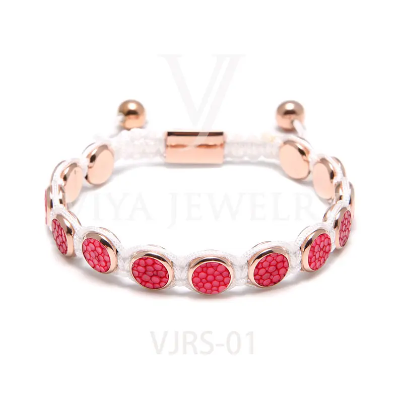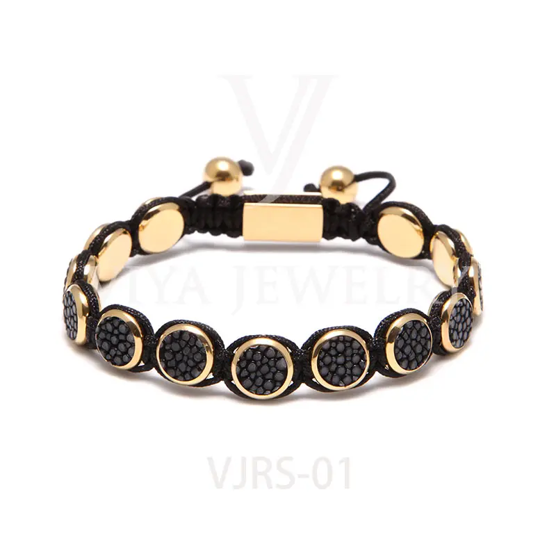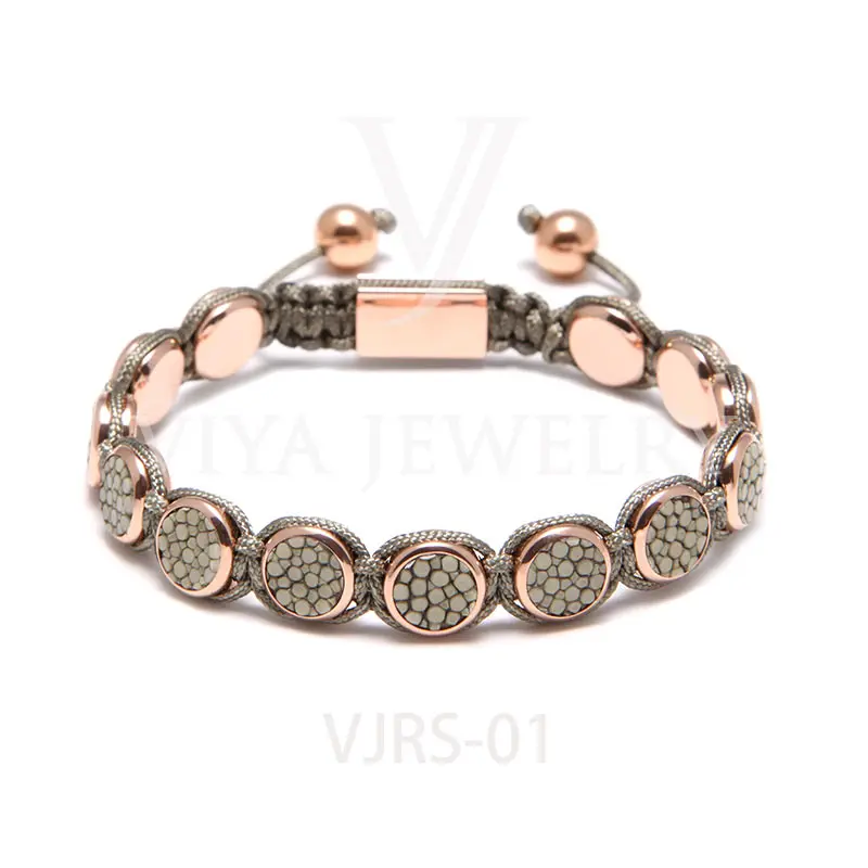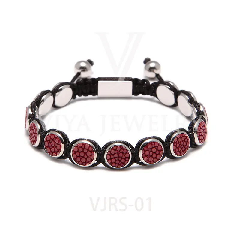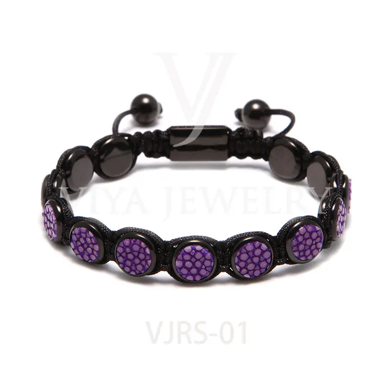 Item No.: VJRS-01 Genuine stingray leather beads bracelet Leather material:Genuine stingray leather Metal material:Surgical 316L stainless steel Available Metal Color:Silver/Rose Gold/18K Gold/BlackWith new technology plated,2years color guarantee Customized logo are welcome MOQ:20pcs Leadtime:Within 5work days DHL Door to door service Worldwilde shipping
