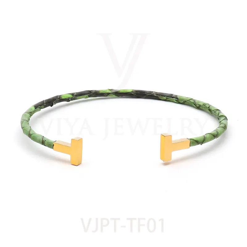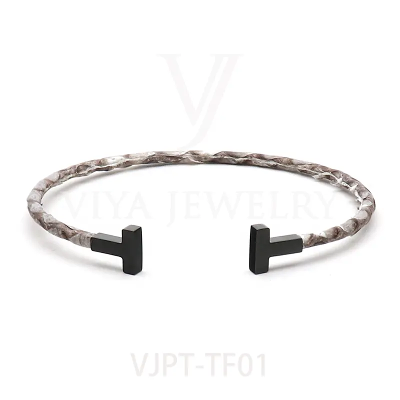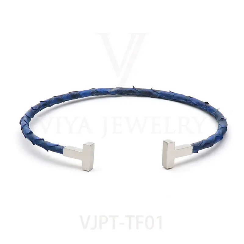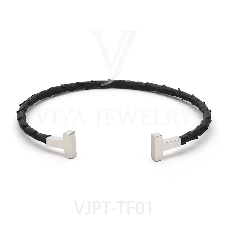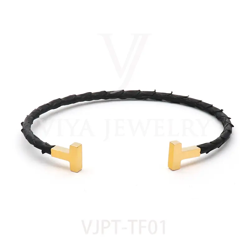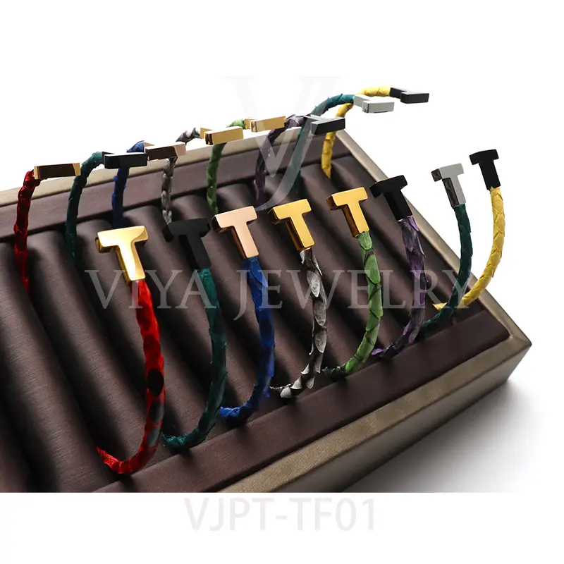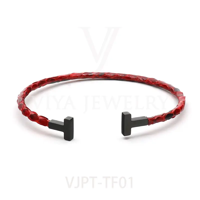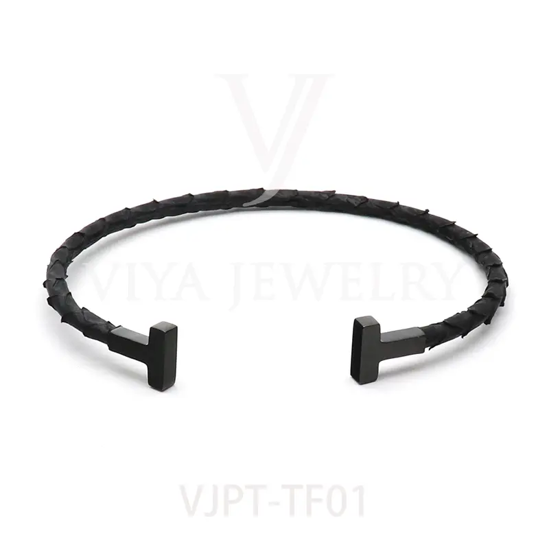 Item NO. :VJPT-TF01 Genuine python leather T bangle Leather material:Genuine python leather Leather Cord thickness :4mm Metal material:Surgical 316L stainless steel Available Metal Color:Silver/Rose Gold/18K Gold/BlackWith new technology plated,2years color guarantee Popular size Female: 17cm 18cm 18.5cm Male:19cm 20cm 21cm Customzied size are available Customized logo are welcome MOQ:20pcs Leadtime:Within 5 work day DHL Door to door service Worldwide shipping