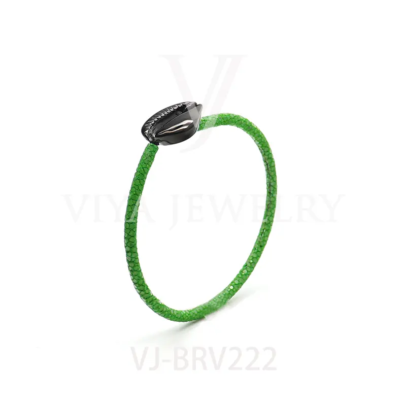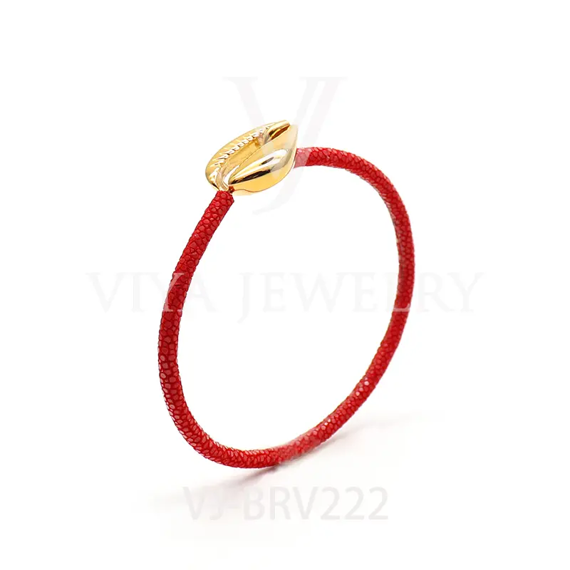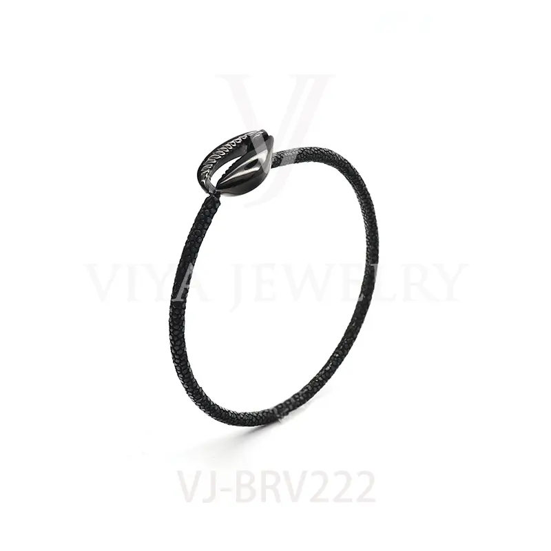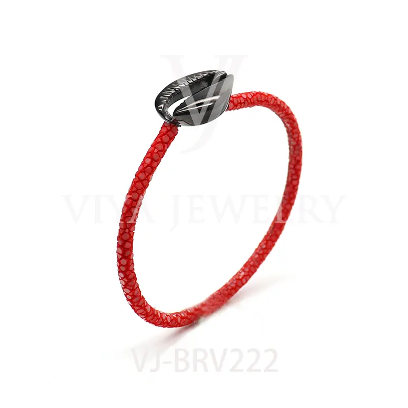 Item No.: VJ-BRV222 Genuine stingray leather shell bracelet Leather material:Genuine stingray leather Metal material:Surgical 316L stainless steel Available Metal Color:Silver/Rose Gold/18K Gold/BlackWith new technology plated,2years color guarantee Customized logo are welcome MOQ:20pcs Leadtime: Within 5 work days DHL Door to door service Worldwide shipping