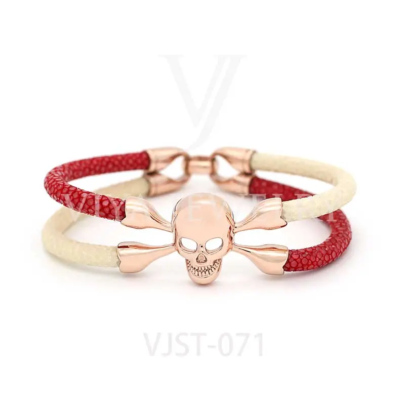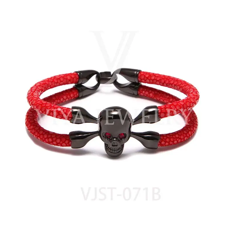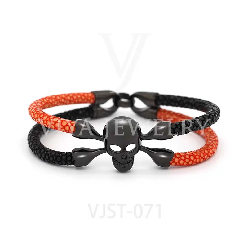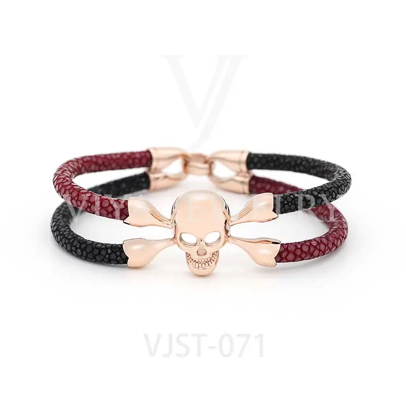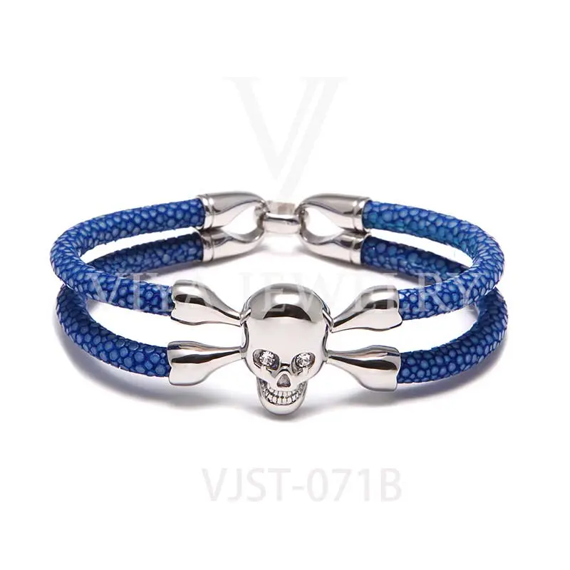 Item No.: VJST-071 Genuine stingray leather skull Bracelet Leather material:Genuine stingray leather Leather Cord thickness :4mm Metal material:Surgical 316L stainless steel with CZ Stone setting Available Nail Metal Color:Silver/Rose Gold/18K Gold/BlackWith new technology plated,2years color guarantee Popular size Female: 17cm 18cm 18.5cm Male:19cm 20cm 21cm Customzied size are available Customized logo are welcome MOQ:20pcs Leadtime:Within 5work days DHL Door to door service Worldwide shipping