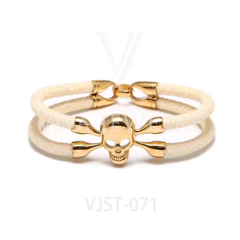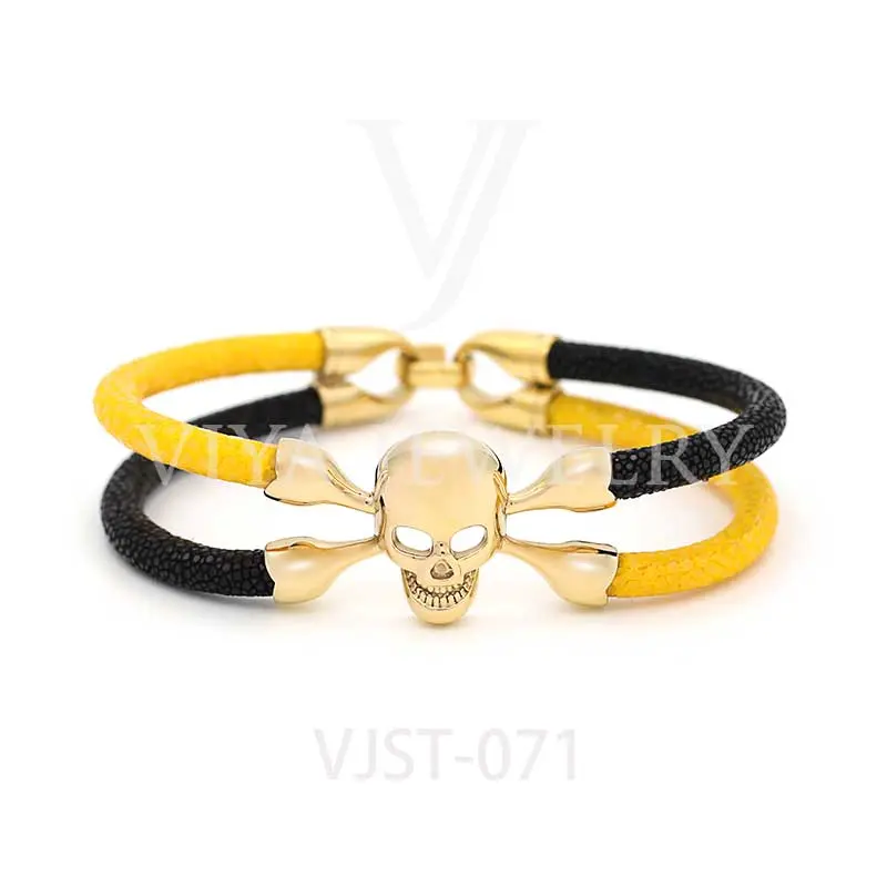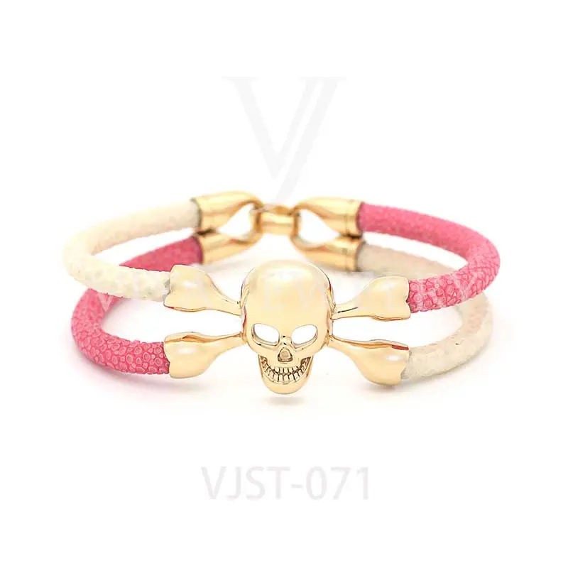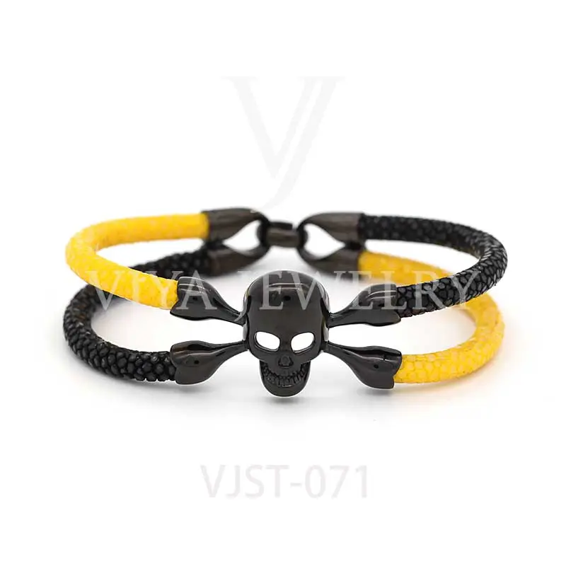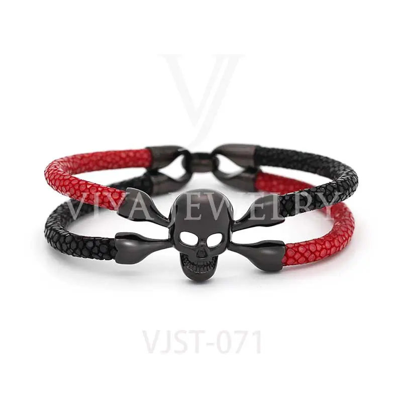 Item No.: VJST-071 Genuine stingray leather skull Bracelet Leather material:Genuine stingray leather Leather Cord thickness :4mm Metal material:Surgical 316L stainless steel with CZ Stone setting Available Nail Metal Color:Silver/Rose Gold/18K Gold/BlackWith new technology plated,2years color guarantee Popular size Female: 17cm 18cm 18.5cm Male:19cm 20cm 21cm Customzied size are available Customized logo are welcome MOQ:20pcs Leadtime:Within 5work days DHL Door to door service Worldwide shipping