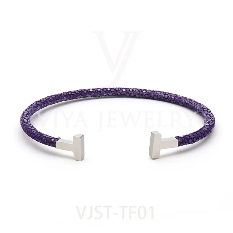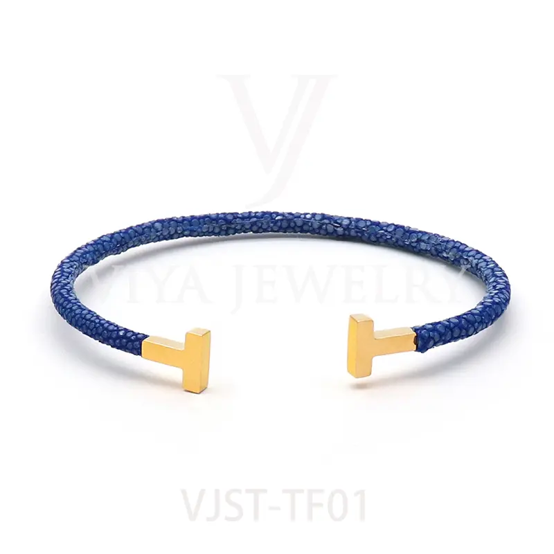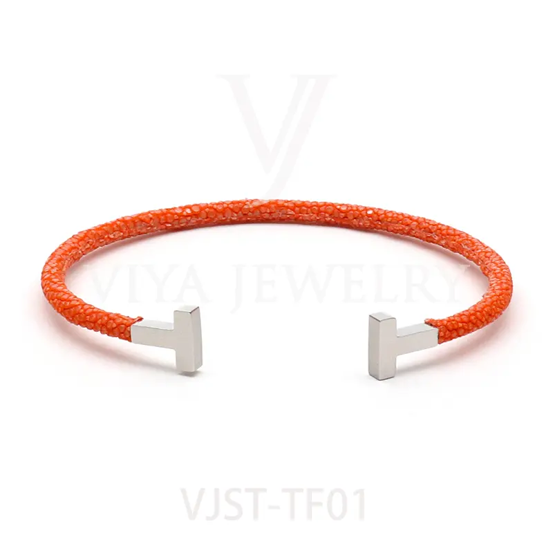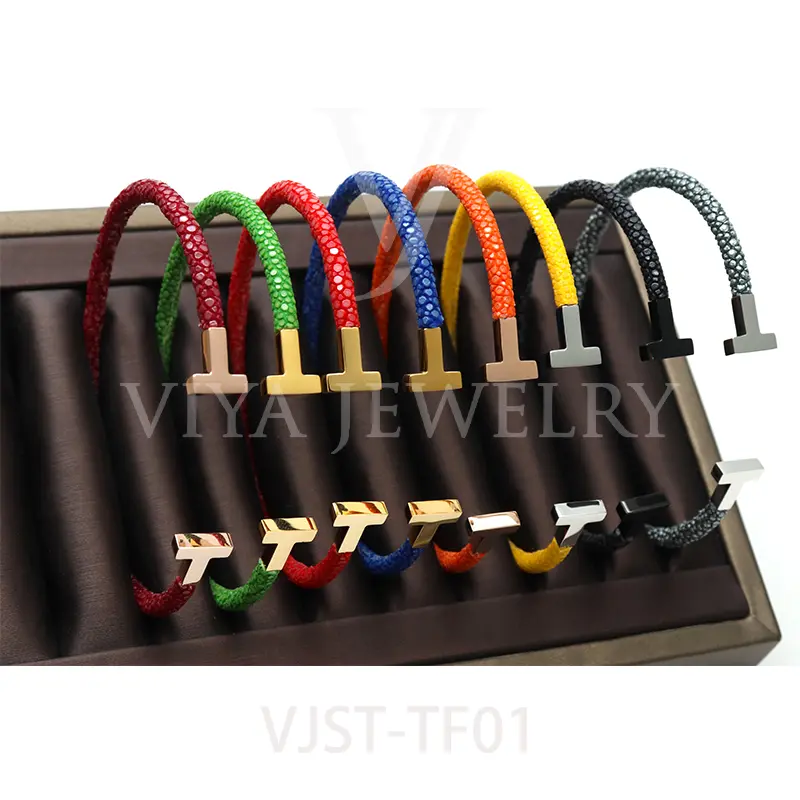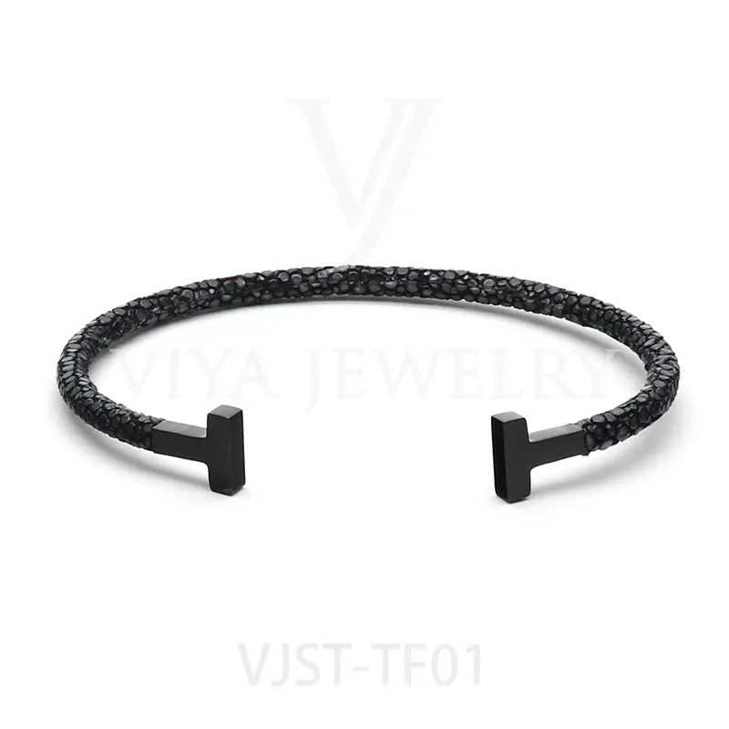 Item NO. :VJST-TF01 Genuine stingray leather T bangle Leather material:Genuine stingray leather Leather Cord thickness :4mm Metal material:Surgical 316L stainless steel Available Metal Color:Silver/Rose Gold/18K Gold/BlackWith new technology plated,2years color guarantee Popular size Female: 17cm 18cm 18.5cm Male:19cm 20cm 21cm Customzied size are available Customized logo are welcome MOQ:20pcs Leadtime: Within 5work day DHL Door to door service Worldwide shipping