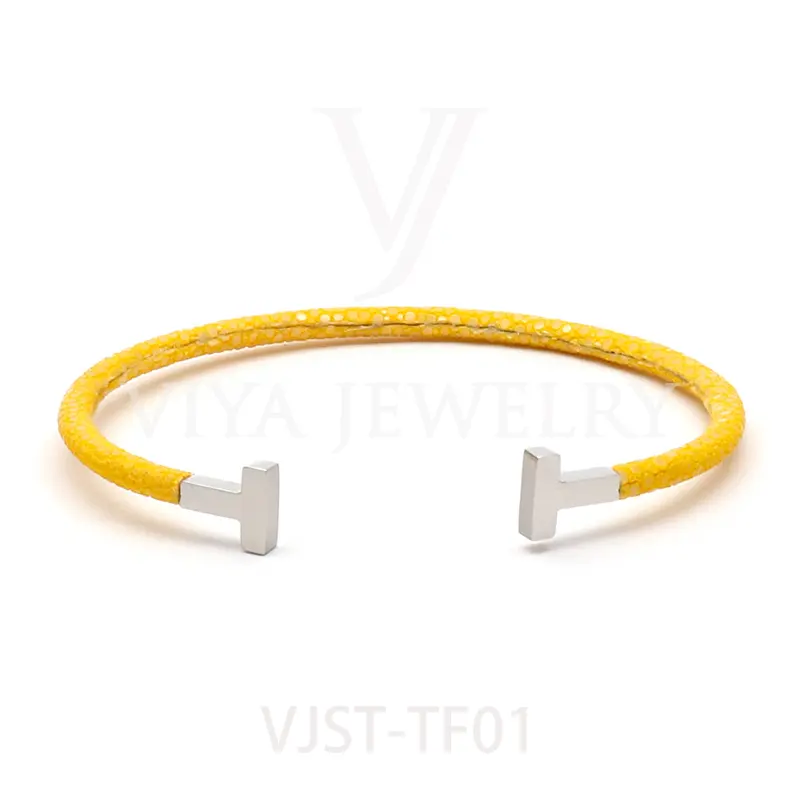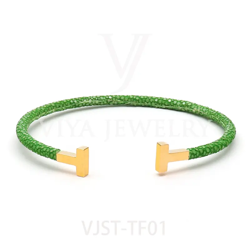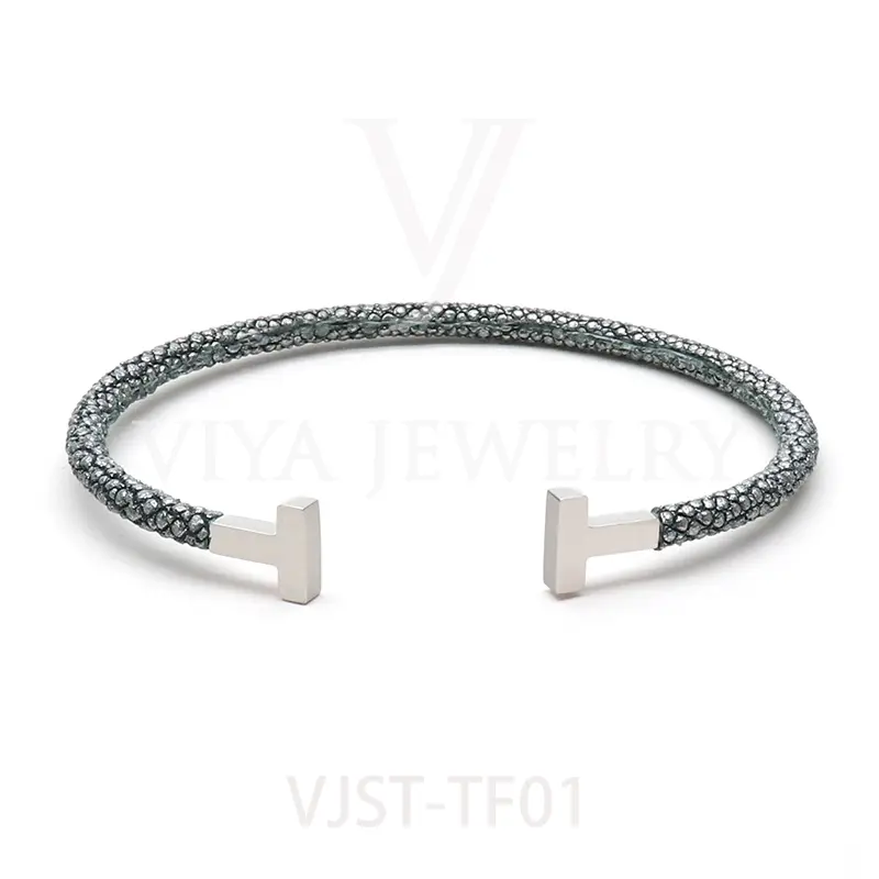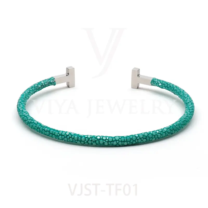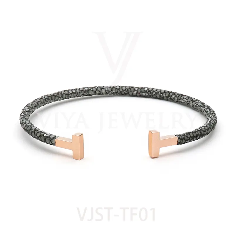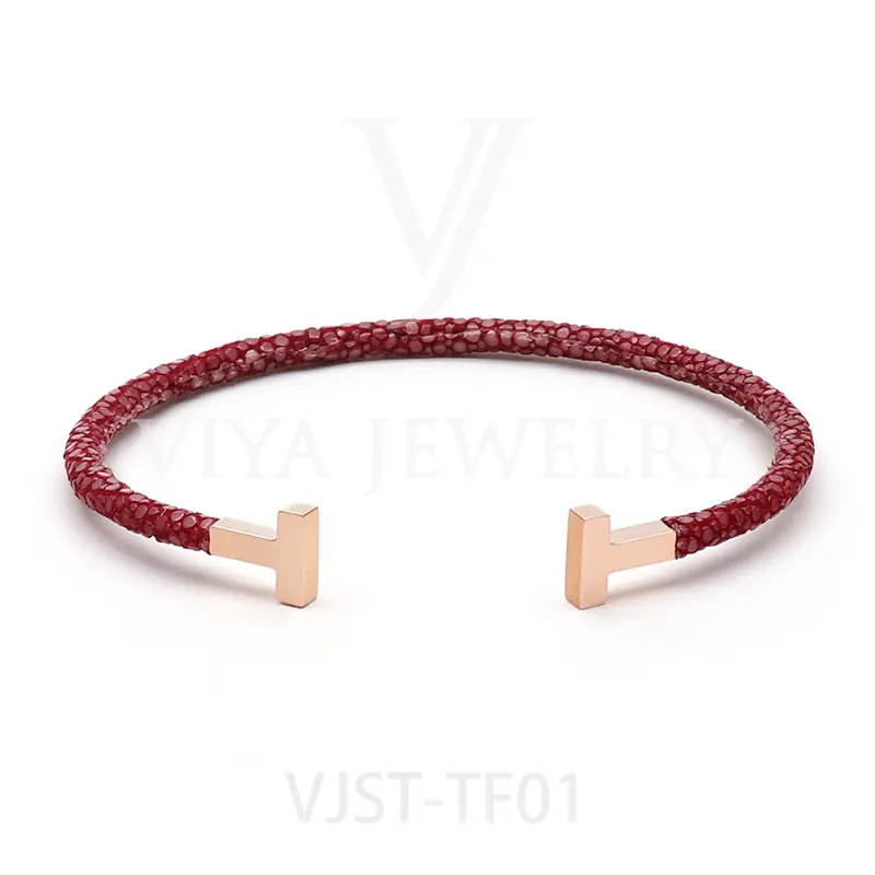 Item NO. :VJST-TF01 Genuine stingray leather T bangle Leather material:Genuine stingray leather Leather Cord thickness :4mm Metal material:Surgical 316L stainless steel Available Metal Color:Silver/Rose Gold/18K Gold/BlackWith new technology plated,2years color guarantee Popular size Female: 17cm 18cm 18.5cm Male:19cm 20cm 21cm Customzied size are available Customized logo are welcome MOQ:20pcs Leadtime: Within 5work day DHL Door to door service Worldwide shipping