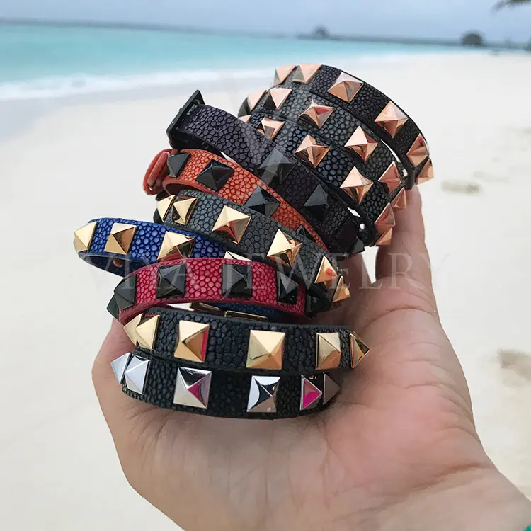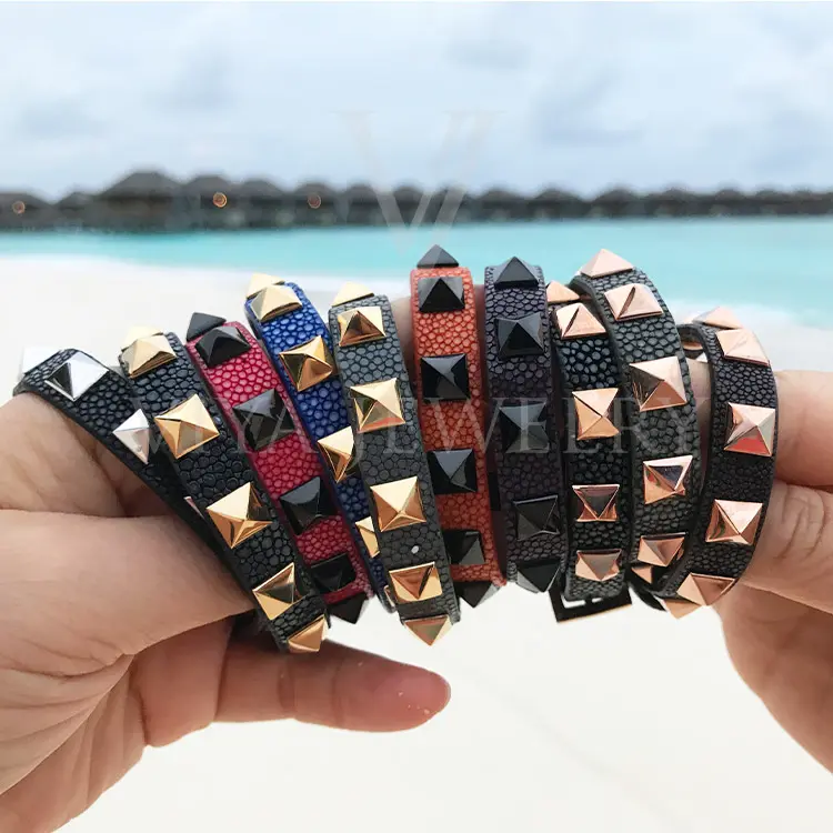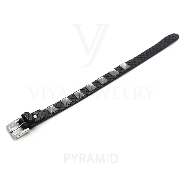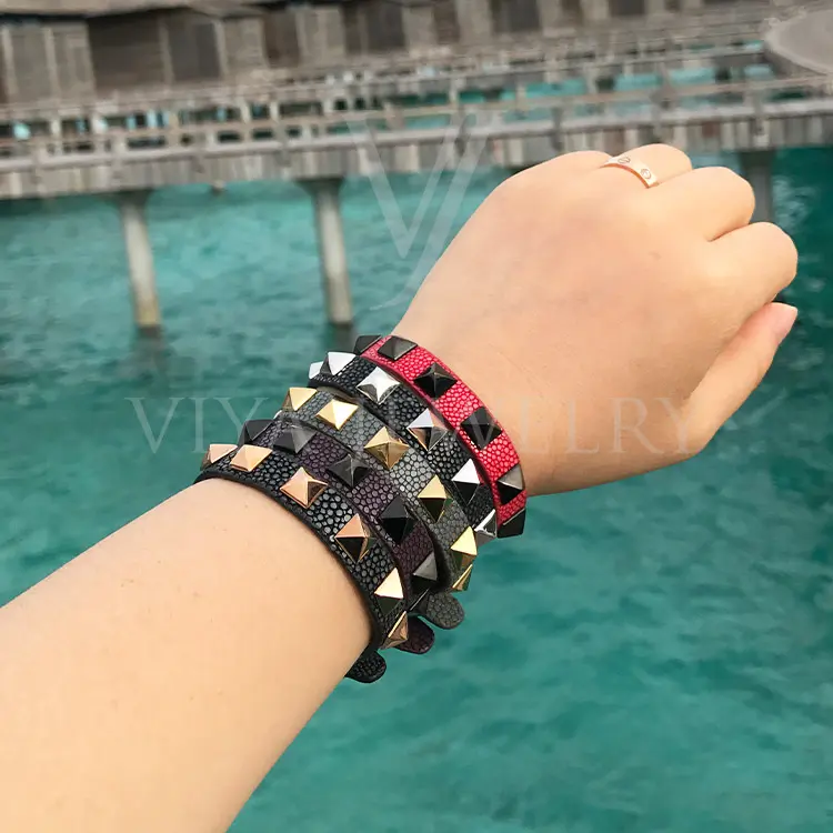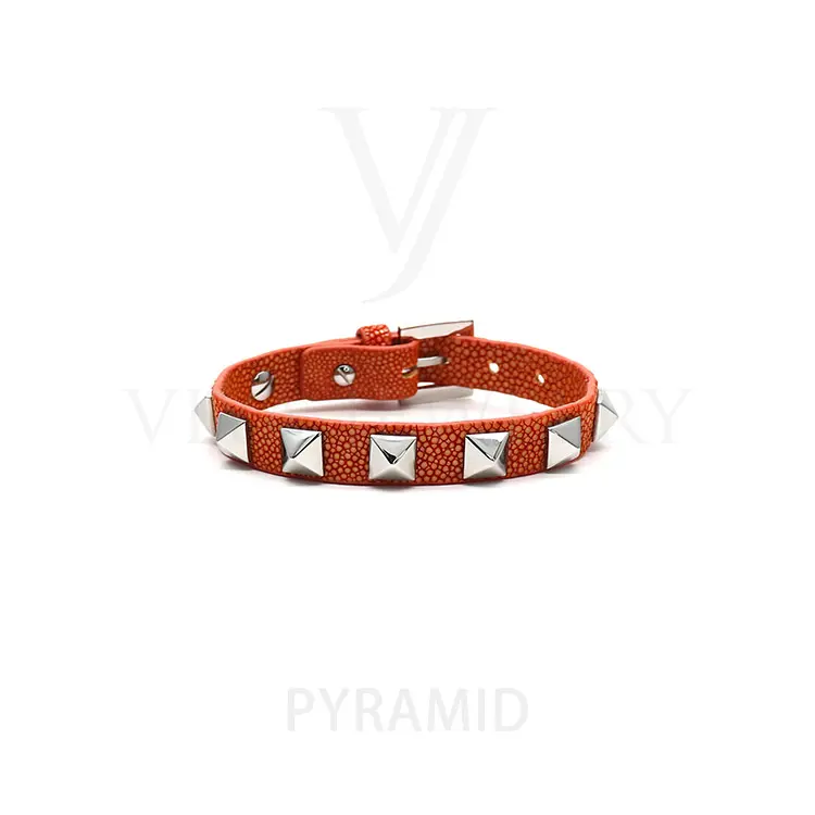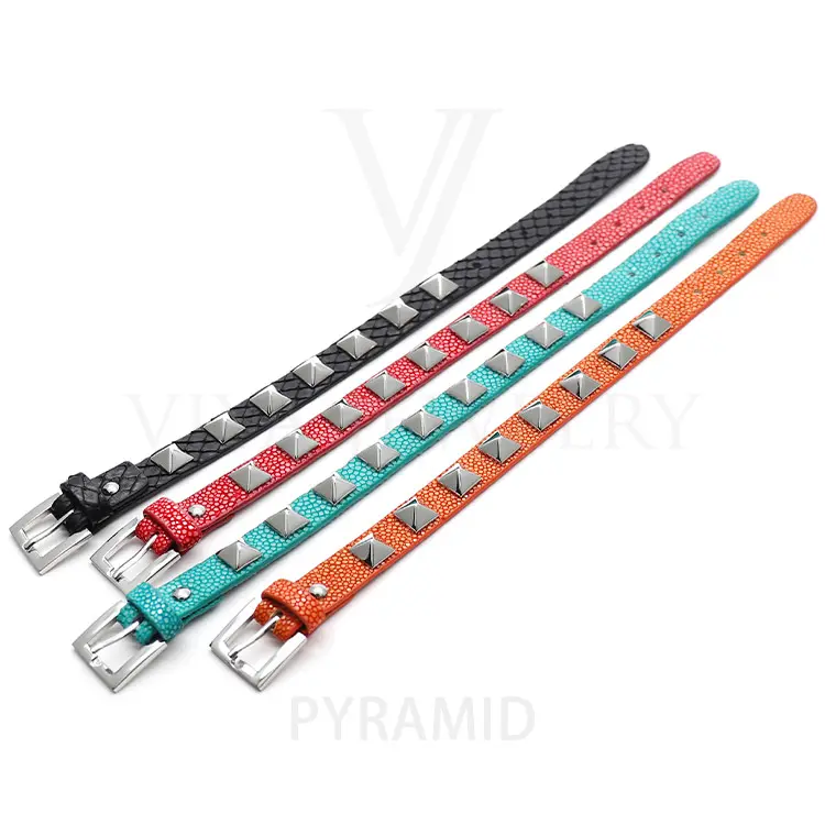 VJST-PB01 Luxury Stainless Steel Pyramid Leather Bracelet Genuine 8mm Flast Stingray Leather Surgical 316L Stainless Steel Pyramid Available Pyramid Metal Color:Silver/Rose Gold/18K Gold/Black With new technology plated 2years color guarantee Popular size Female: 17cm-20cm (adjustable) Male:19cm-24cm(adjustable) Customzied size are available Customized logo are welcome MOQ:20pcs Leadtime: Within 5work days DHL Door to door service Worldwide shipping
