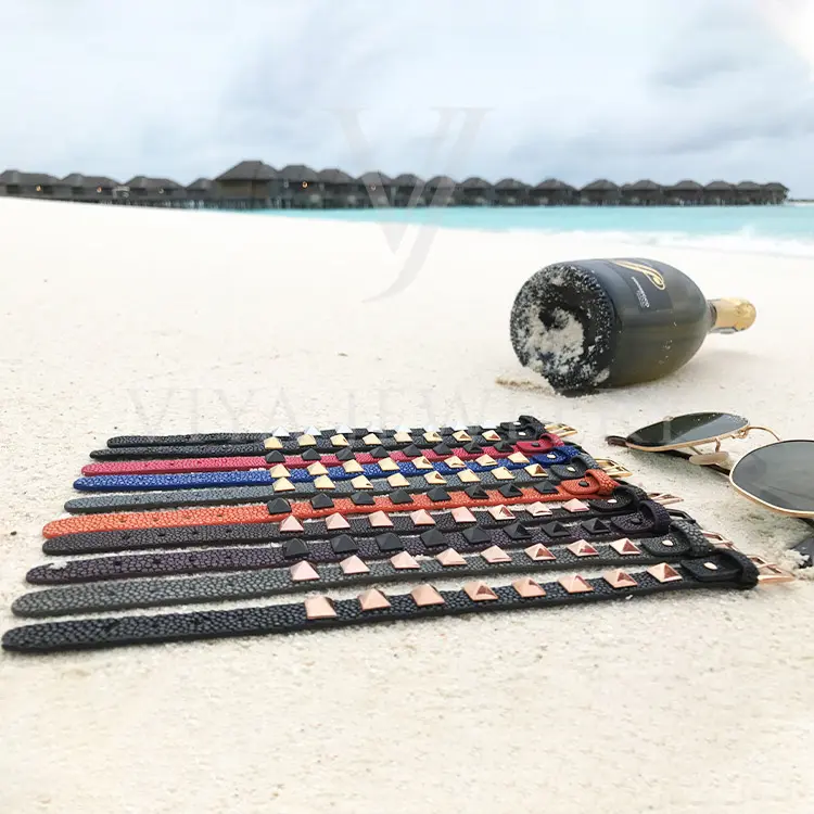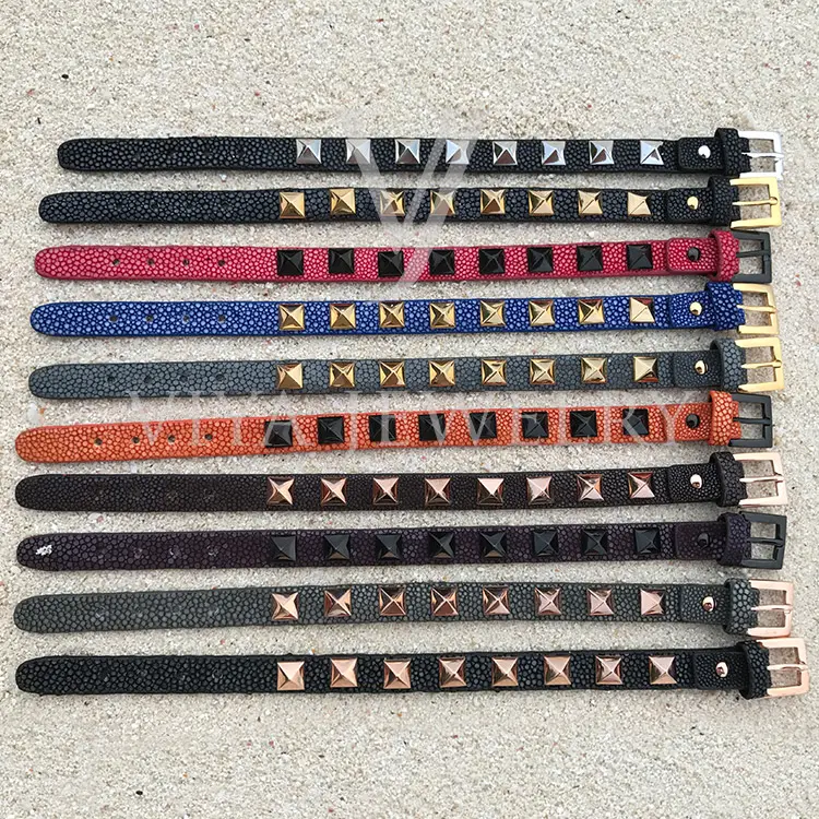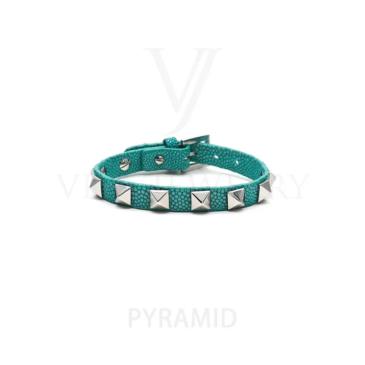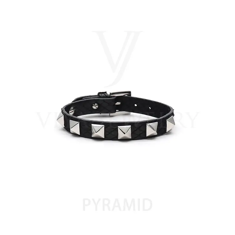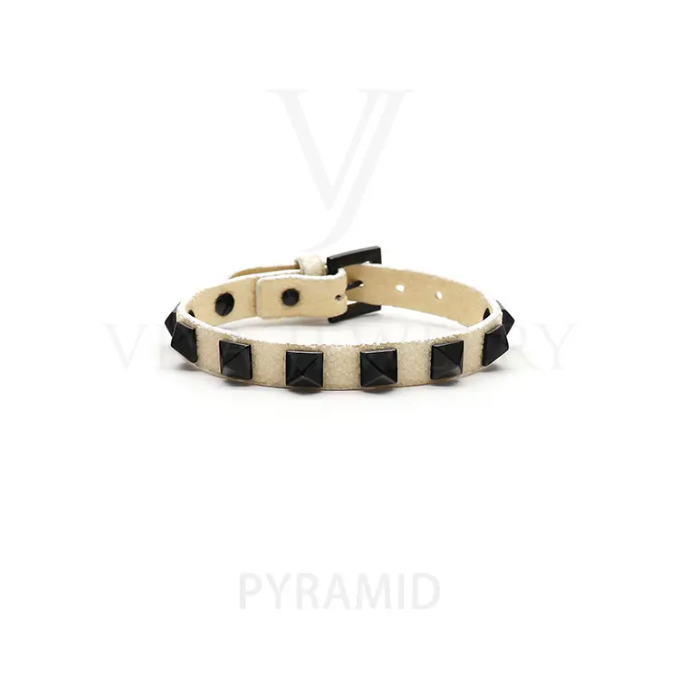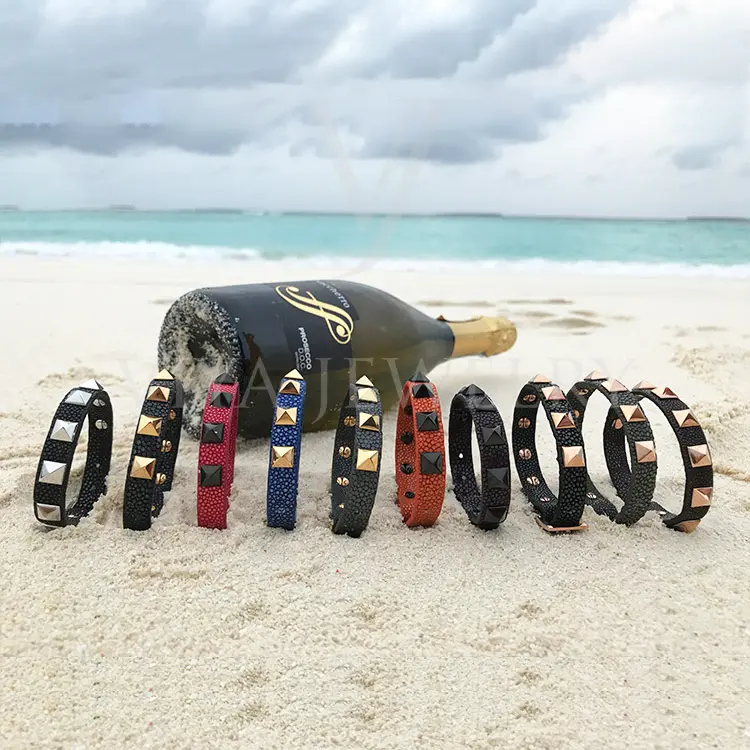 VJST-PB01 Luxury Stainless Steel Pyramid Leather Bracelet Genuine 8mm Flast Stingray Leather Surgical 316L Stainless Steel Pyramid Available Pyramid Metal Color:Silver/Rose Gold/18K Gold/Black With new technology plated 2years color guarantee Popular size Female: 17cm-20cm (adjustable) Male:19cm-24cm(adjustable) Customzied size are available Customized logo are welcome MOQ:20pcs Leadtime: Within 5work days DHL Door to door service Worldwide shipping